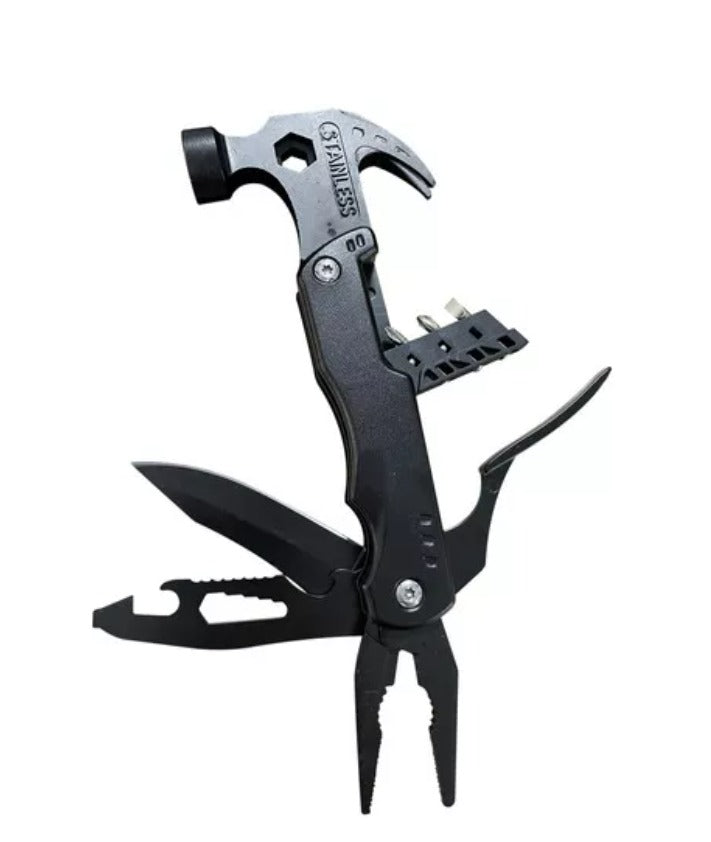 Con 14 funciones, como alicates, cuchillo, sierra, abridor de botellas y más, este martillo es el compañero ideal para todo tipo de emergencias y proyectos.