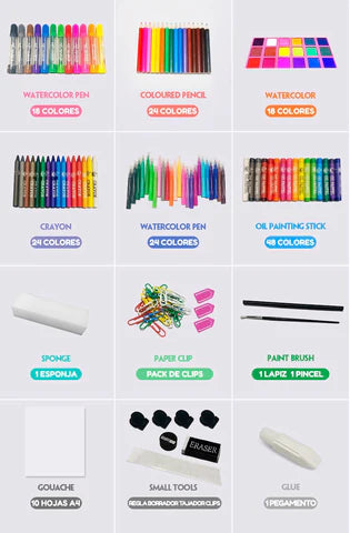 Este mega set de arte está diseñado para liberar el potencial artístico de tus hijos. Incluye pasteles al óleo, crayones, lápices de colores, bolígrafos de acuarela y un caballete de doble cara para una experiencia de dibujo completa. Fomenta la creatividad, mejora la coordinación mano-ojo y ofrece horas de diversión en cualquier lugar.
